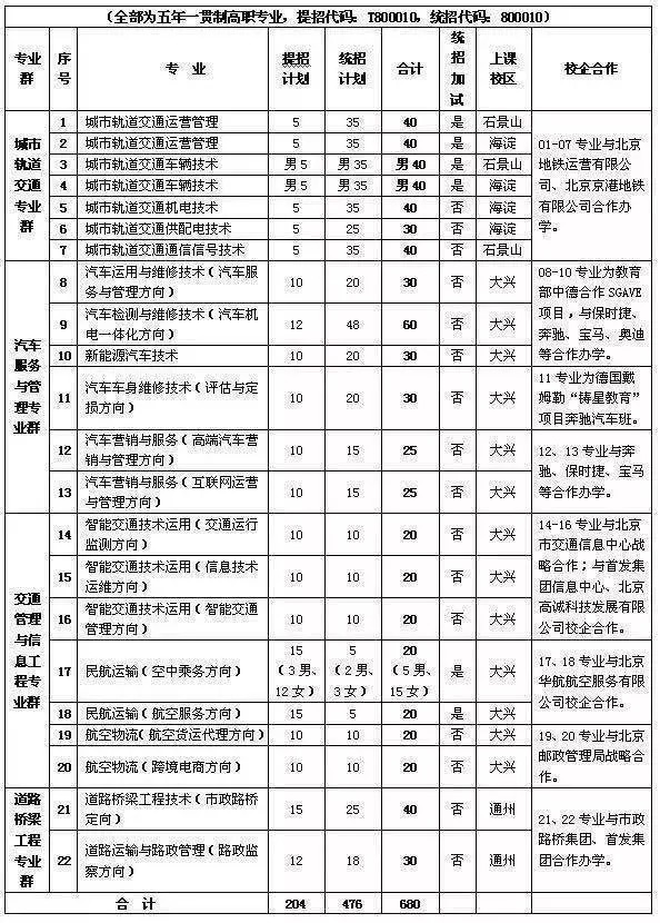 2017年北京交通运输职业学院中考全部为五年一贯制高职计划。