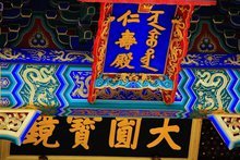 东宫门区在颐和园最东边。这一带原是清朝皇帝从事政治活动和生活起居的地方,包括朝见大臣的仁寿殿和南北朝房、寝宫、大戏台、庭院等。门楣檐下全部用油彩描绘着绚丽的图案。六扇朱红色大门上嵌着整齐的黄色门钉,中间檐下挂着九龙金字大匾,上书“颐和园”三个大字,为光绪皇帝御笔亲题。门前御道丹陛上的云龙石雕刻着二龙戏珠,为乾隆年代所刻,是从圆明园废墟(安佑宫)上移来的,它是皇帝尊严的象征。东宫门当年只供清朝帝后出入。仁寿殿在颐和园大门东宫门内。是慈禧太后和光绪皇帝坐朝听政、会见外宾的大殿。原名勤政殿,光绪时重建,改称仁寿殿。东向,面阔七间,两侧有南北配殿,前有仁寿门,门外为南北九卿房。[6]