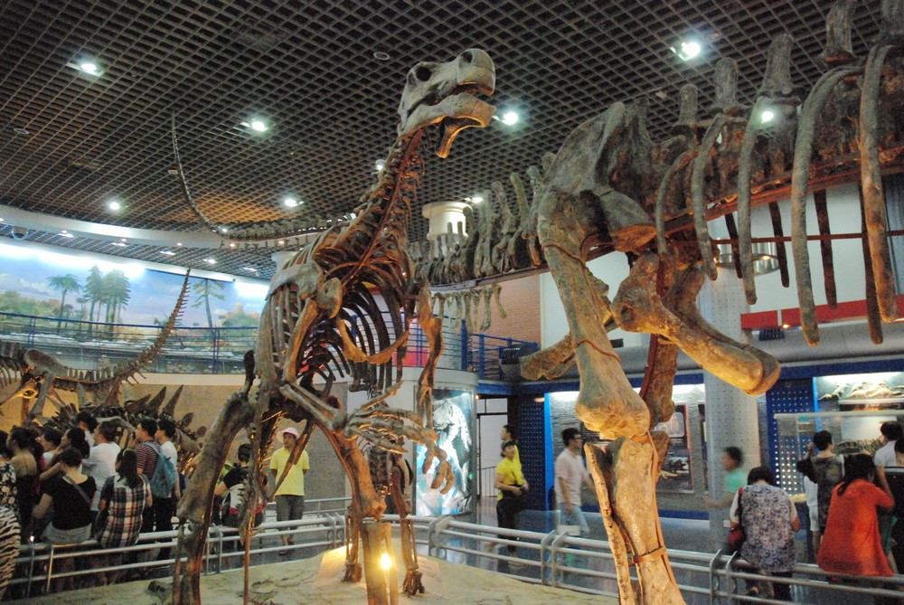 大厅中央展示了栩栩如生的恐龙骨架群,如中国人发现的第一条恐龙--许氏禄丰龙,体长达26米的井研马门溪龙,称王称霸的霸王龙,小巧玲珑的恐爪龙,背上布满剑板的沱江龙,威风凛凛的永川龙,展翅翱翔的翼龙,称霸海洋的鱼龙。