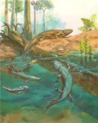 在大约3亿6千万年前,地壳变动,海陆变迁,一群勇敢的鱼——总鳍鱼类率先爬上了陆地。它们学会了用肺呼吸,鳍也变成了强壮的四肢,并更名换姓改称“两栖”,完成了脊椎动物由水登陆的一次重大的飞跃。这个“登陆”的过程对它们来说只是一小步,但对于生命的演化来说却是一大步。从此陆地上热闹起来了,四条腿的动物们有的爬行,有的奔跑,有的还生出羽翼飞上了天空。这一切都是源自“两栖”的发生。