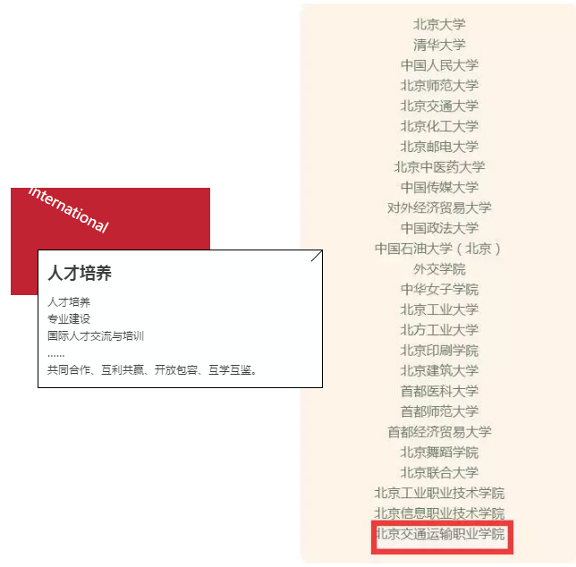 北京交通运输职业学院是北京仅入选的三所高职院校之一,与北大、清华齐名,共同入选首批北京市“一带一路”国家人才培养基地项目。未来,我们也将不负重任,继续改革创新,立足国际舞台,展现出交通职业院校的实力,成为大国外交的一分子!
